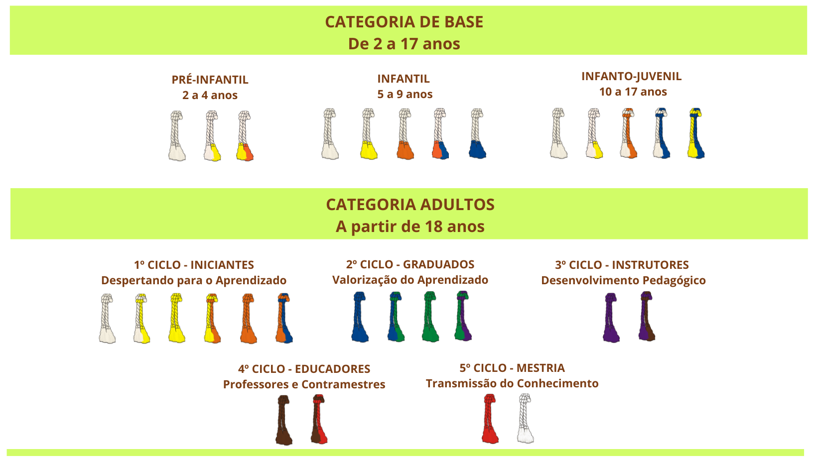 O nosso sistema de graduação é semelhante ao da ABADÁ CAPOEIRA, usamos as mesmas cores tendo como referência a natureza.