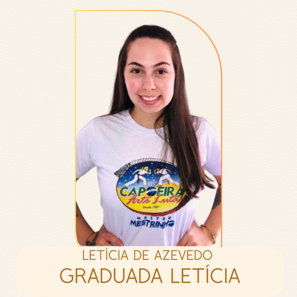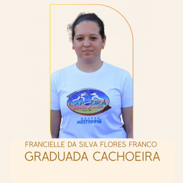 Nascida em Cascavel (PR) em 1999, iniciou a prática de Capoeira em 2007. Graduada em Pedagogia, pós graduada em Gestão Escolar e acadêmica de Educação Física. Ministra aula de Capoeira em escolas privadas e municipais que ofertam educação em tempo integral desde 2015.